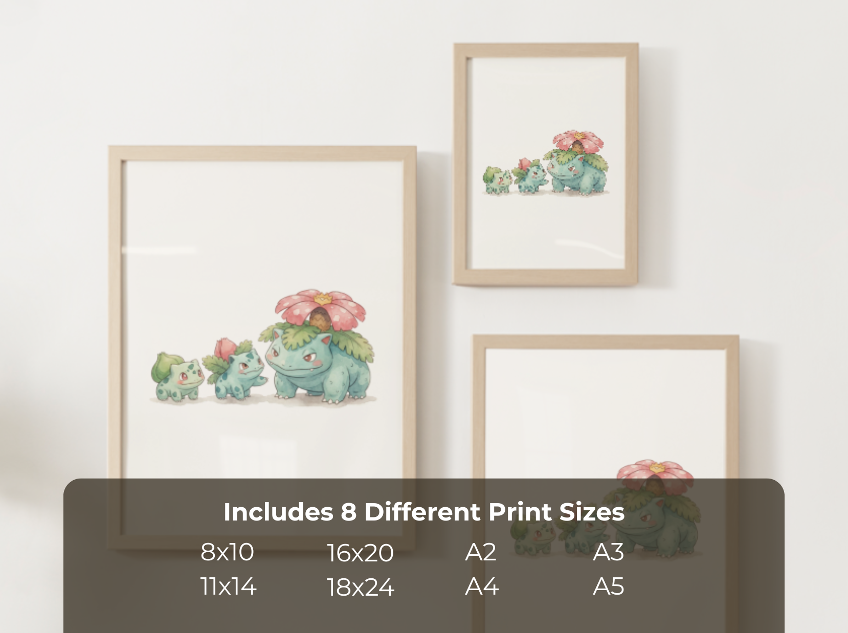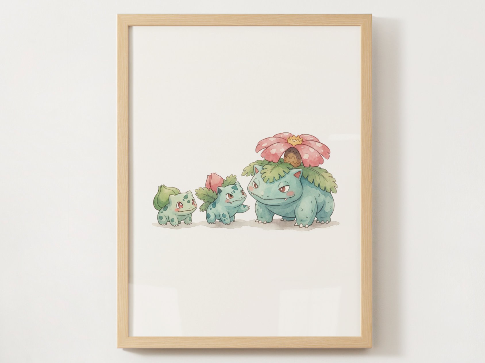 This print captures Bulbasaur and its evolutions together in a soft nursery friendly watercolor style. The lineup is arranged to feel cohesive and connected, making it a perfect fit for a Pokémon themed kids room or an evolution collection that grows with your little one.
