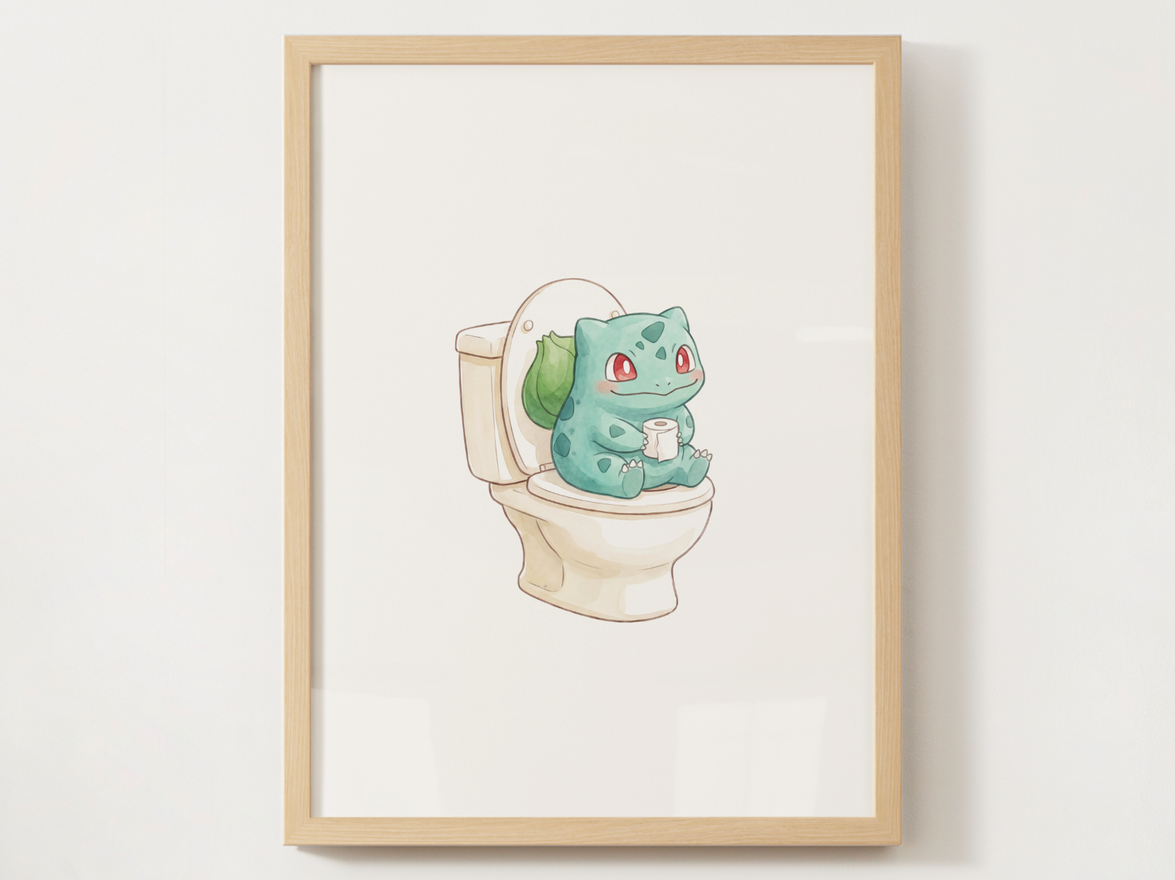 Print your Bulbasaur bathroom wall art today and give your washroom a cute, funny upgrade.