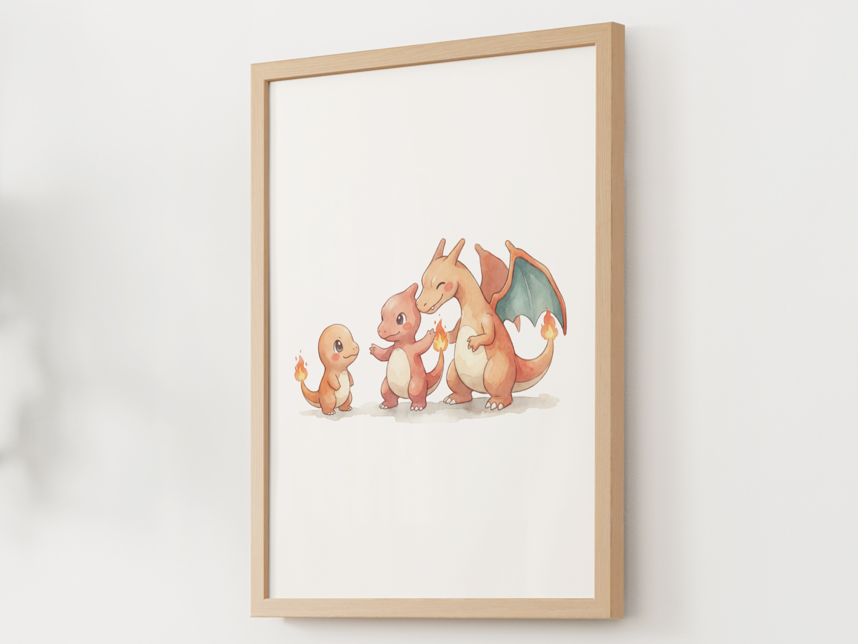 This print captures Charmander, Charmeleon, and Charizard together in a soft nursery friendly watercolor style. The trio is arranged to feel cohesive and connected, making it a perfect fit for a Pokémon themed kids room or an evolution collection that grows with your little one.