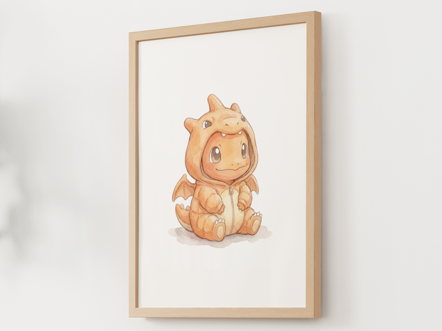 Bring cozy Kanto starter nostalgia to your nursery or kids room with this Charmander onesie poster designed to feel soft, clean, and frame ready. This print features Charmander in an adorable onesie inspired by its evolution line, styled in gentle colors with a calm, centered layout that keeps the space warm and peaceful.