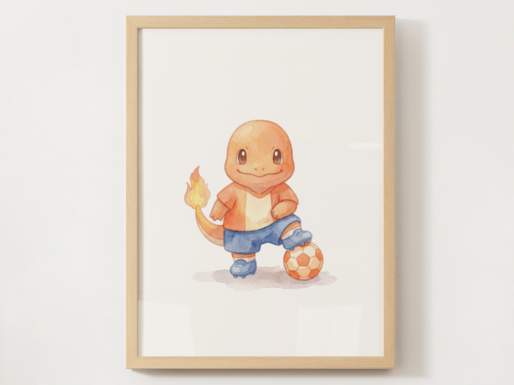 Bring playful match day vibes to your nursery or kids room with this Charmander soccer wall poster designed to feel clean, fun, and frame ready. This single print features Charmander in a soccer themed scene styled with soft colors and a calm, centered layout that keeps the design energetic yet nursery friendly.