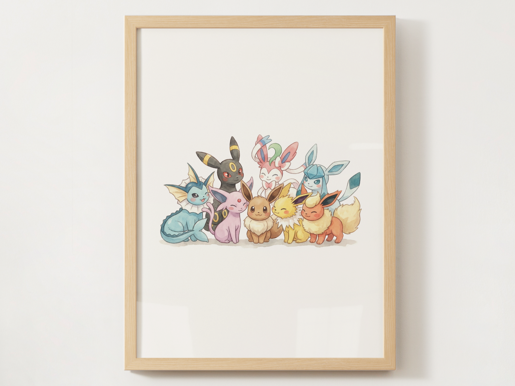 This print captures Eevee and its evolutions together in a soft nursery friendly watercolor style. The lineup is arranged to feel cohesive and connected, making it a perfect fit for a Pokémon themed kids room or an evolution collection that grows with your little one.