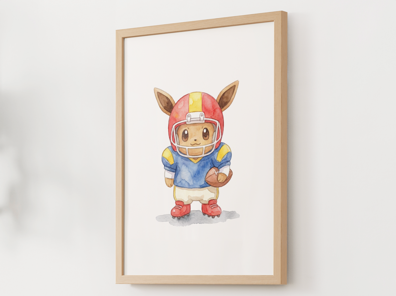 Bring playful game day vibes to your nursery or kids room with this Eevee football wall poster designed to feel clean, fun, and frame ready. This single print features Eevee in a football themed scene styled with soft colors and a calm, centered layout that keeps the design energetic yet nursery friendly.