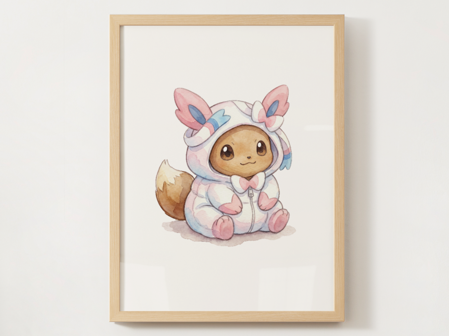 Bring cozy Eevee nostalgia to your nursery or kids room with this Eevee in a Sylveon inspired onesie poster designed to feel soft, clean, and frame ready. This print features Eevee wearing an adorable Sylveon style onesie, illustrated in gentle pastel tones with a calm, centered layout that keeps the space warm and peaceful.