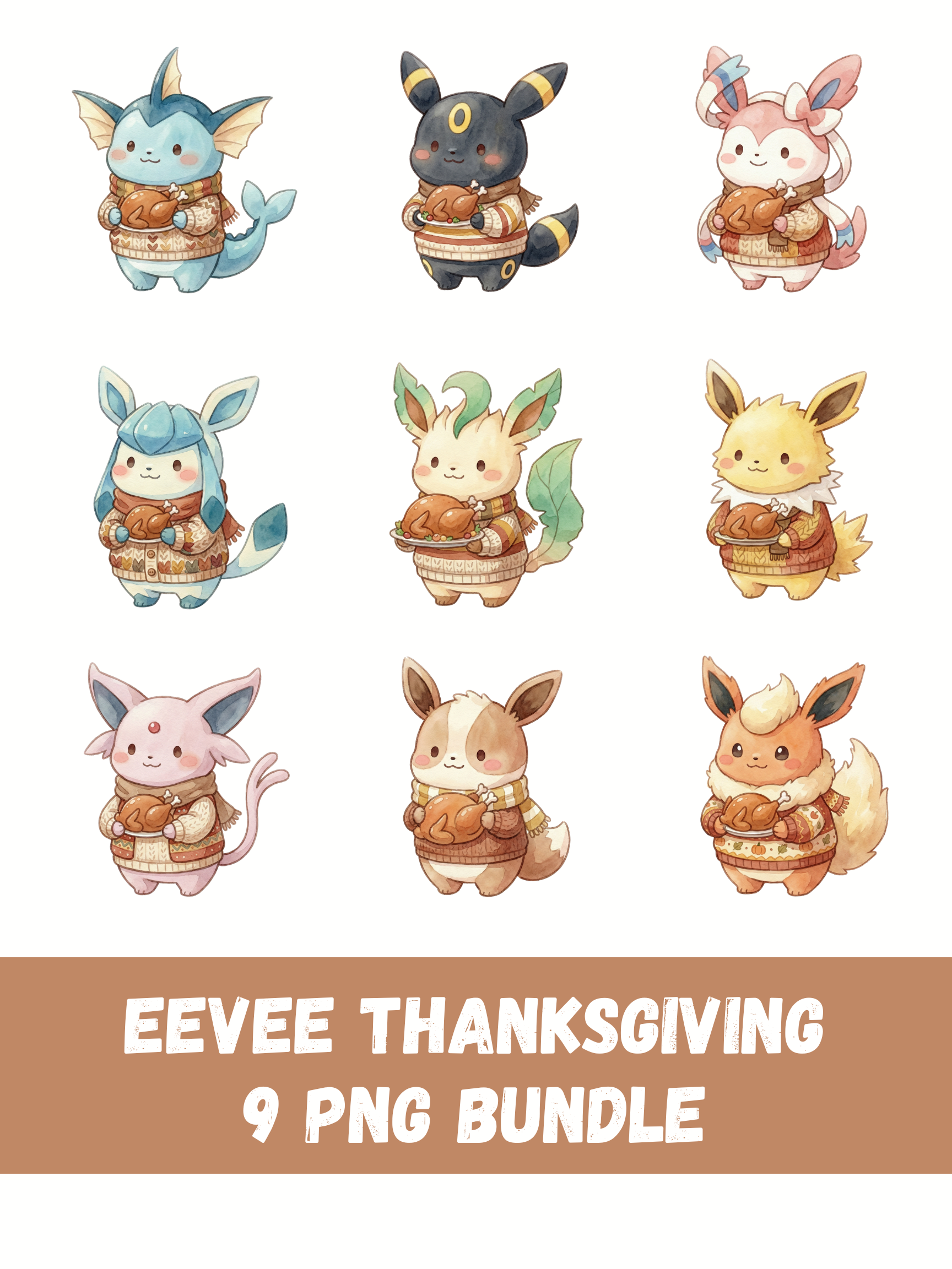 You will receive 1 high quality PNG file featuring Eevee holding a roasted turkey in an adorable Thanksgiving pose. The design is centered, clean, and easy to use in a wide range of creative projects.