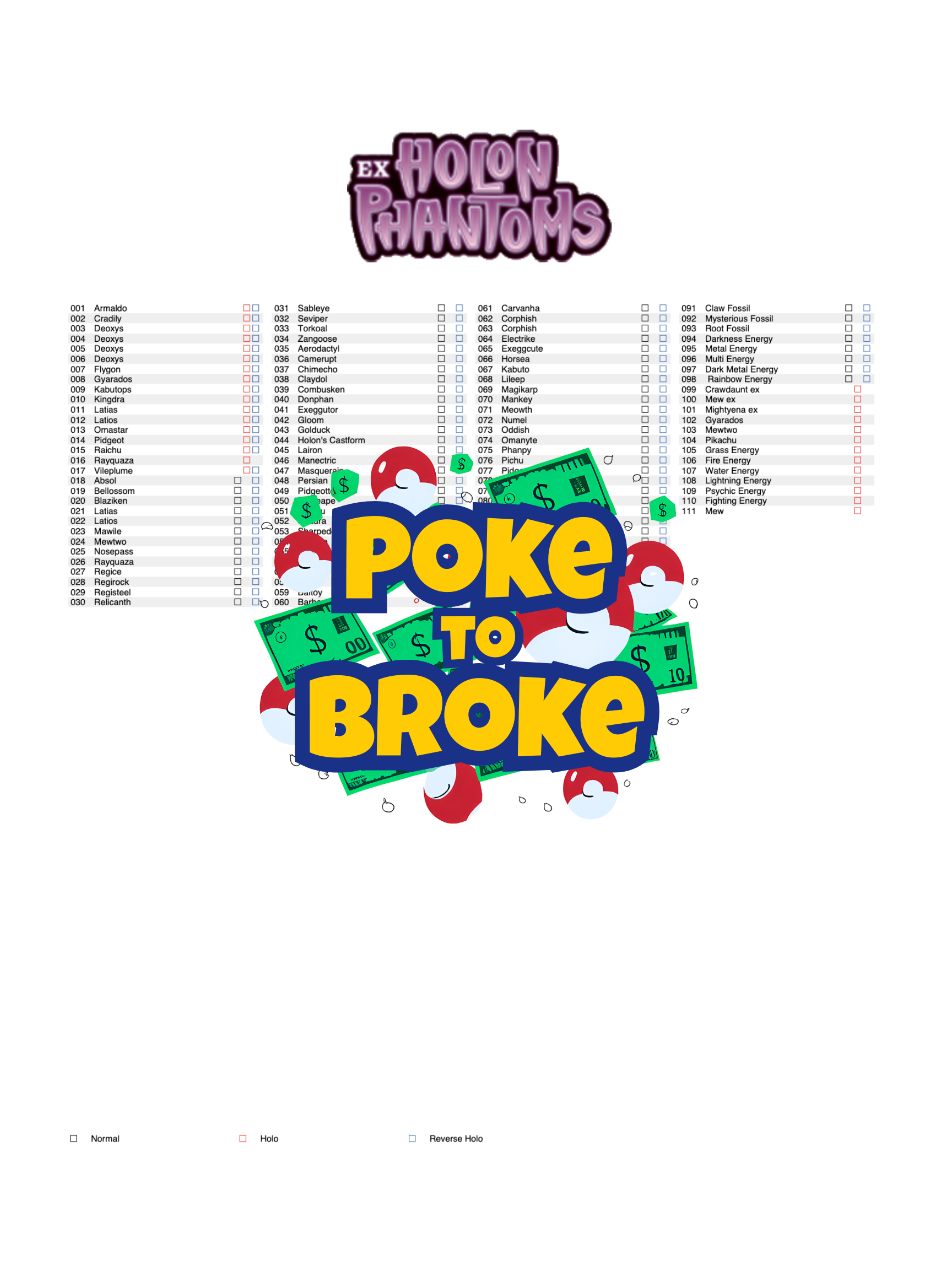Complete your EX Holon Phantoms binder with these printable placeholders featuring actual card images. Every card from the set is represented visually, so your binder looks full and organized even while you are still chasing down cards.