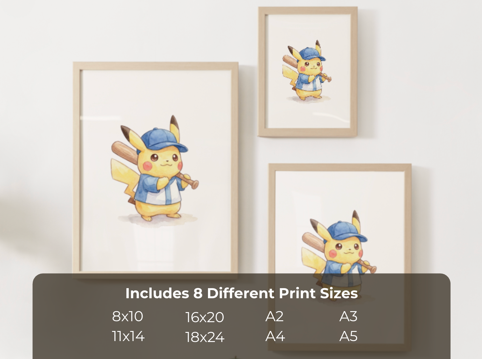 Bring playful ballpark vibes to your nursery or kids room with this Pikachu baseball wall poster designed to feel clean, fun, and frame ready. This single print features Pikachu in a baseball themed scene styled with soft colors and a calm, centered layout that keeps the design energetic yet nursery friendly.