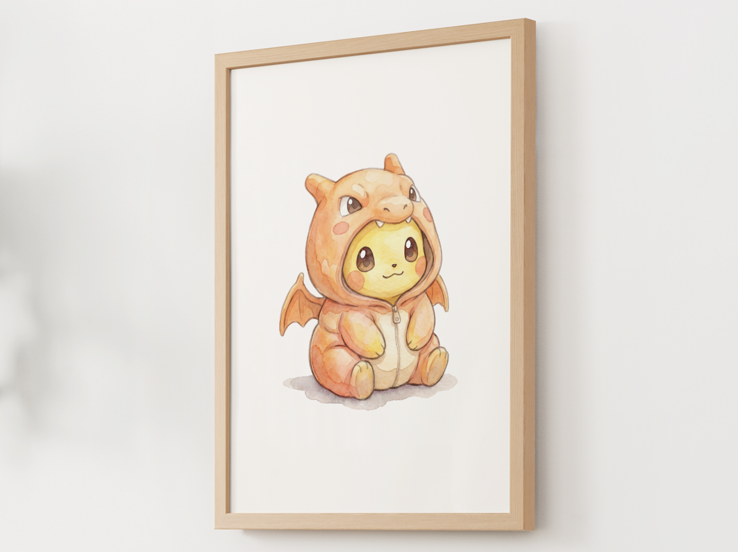 Bring cozy Pokémon nostalgia to your nursery or kids room with this Pikachu in a Charizard inspired onesie poster designed to feel soft, clean, and frame ready. This print features Pikachu wearing an adorable Charizard style onesie, styled in gentle colors with a calm, centered layout that keeps the space warm, playful, and peaceful.