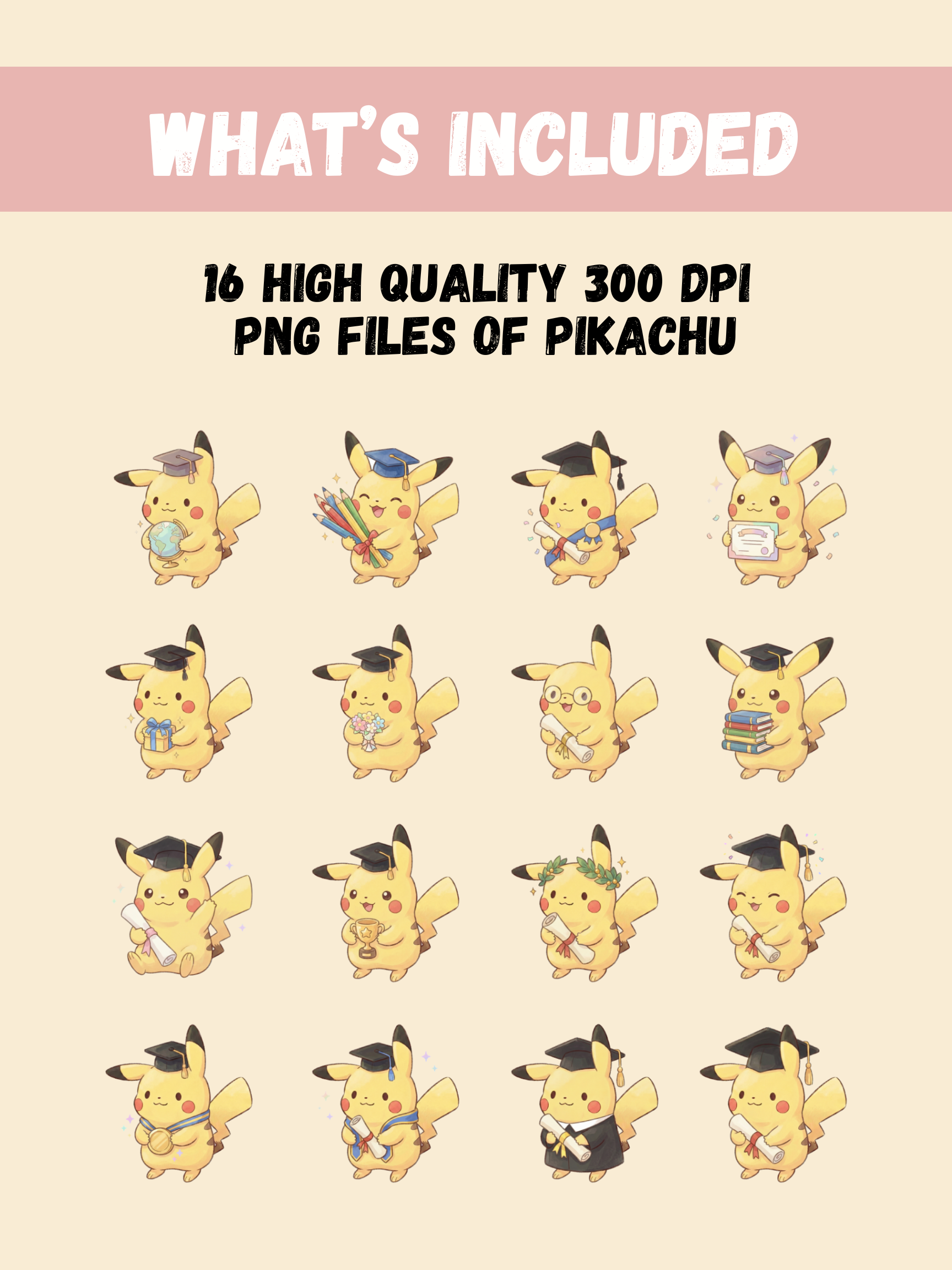 You will receive 16 high quality PNG files, each featuring Pikachu in a different graduation pose with classic grad accessories.