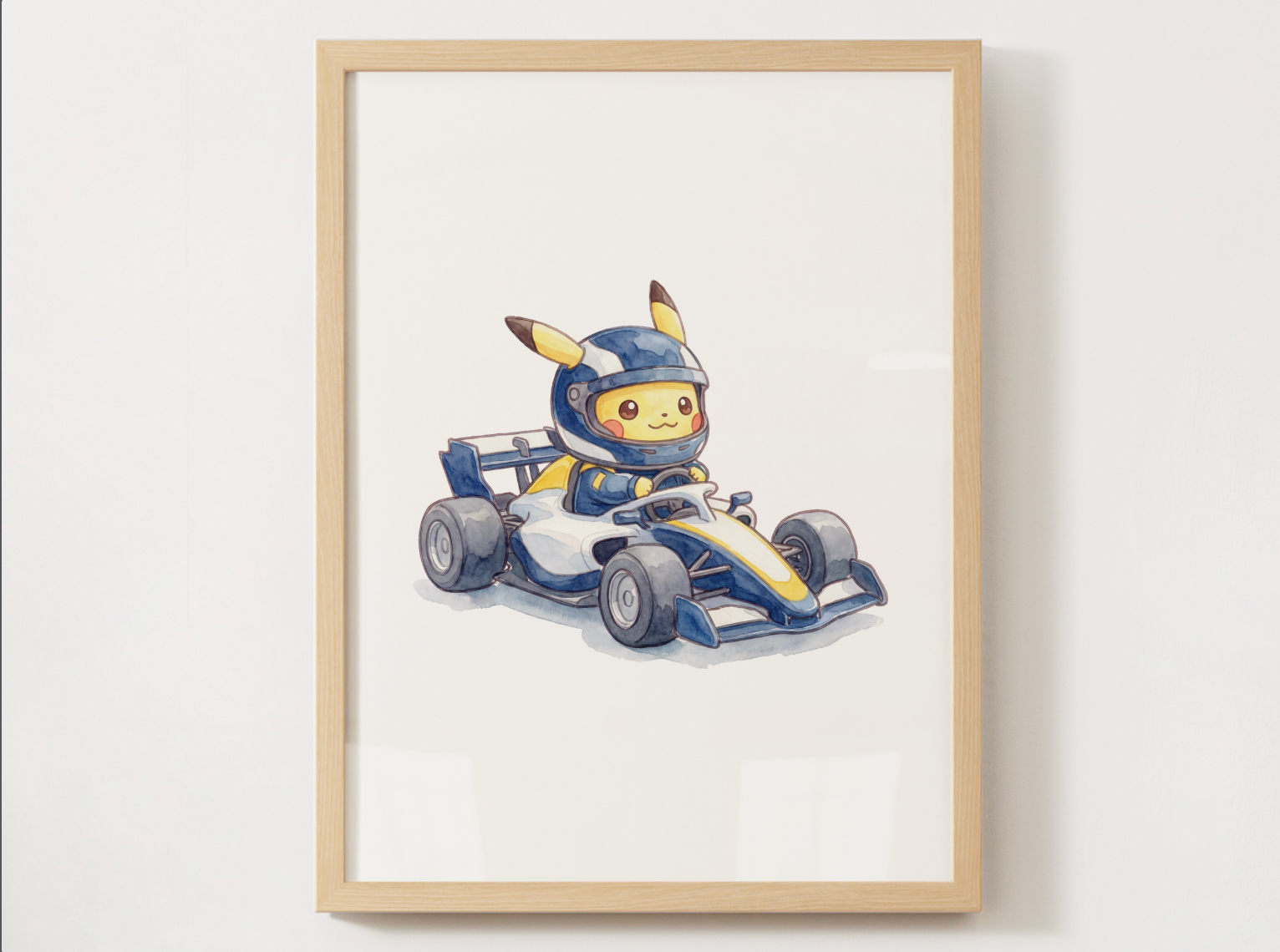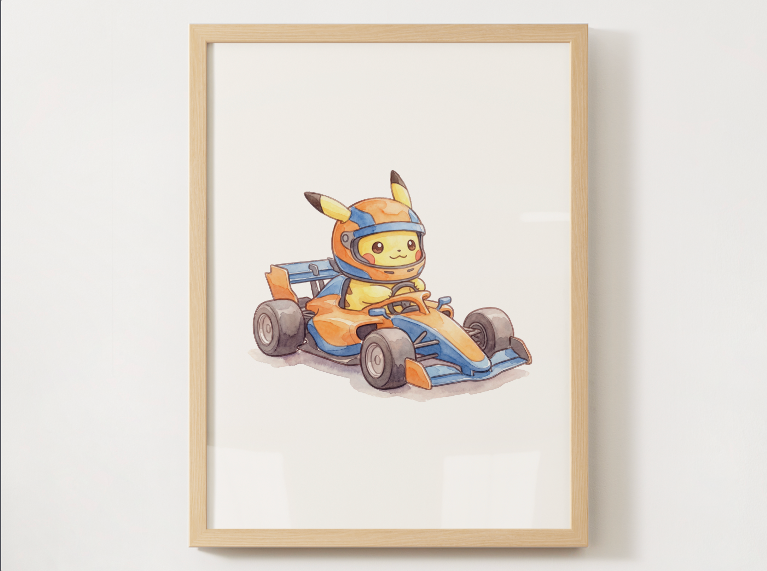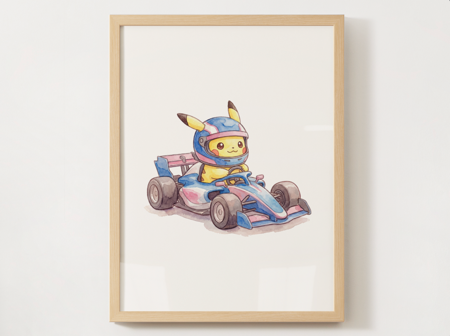 Bring race day energy to your nursery or kids room with this 8 print Pikachu race car bundle designed to feel clean, playful, and frame ready. Each poster features Pikachu in a formula style racing theme with soft colors and a calm, centered layout that keeps the room cozy while still feeling fast and fun.