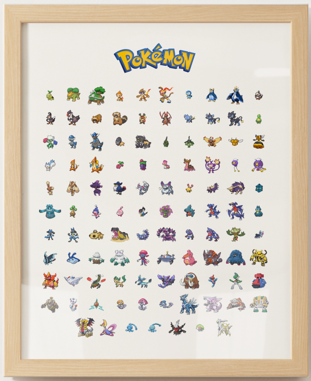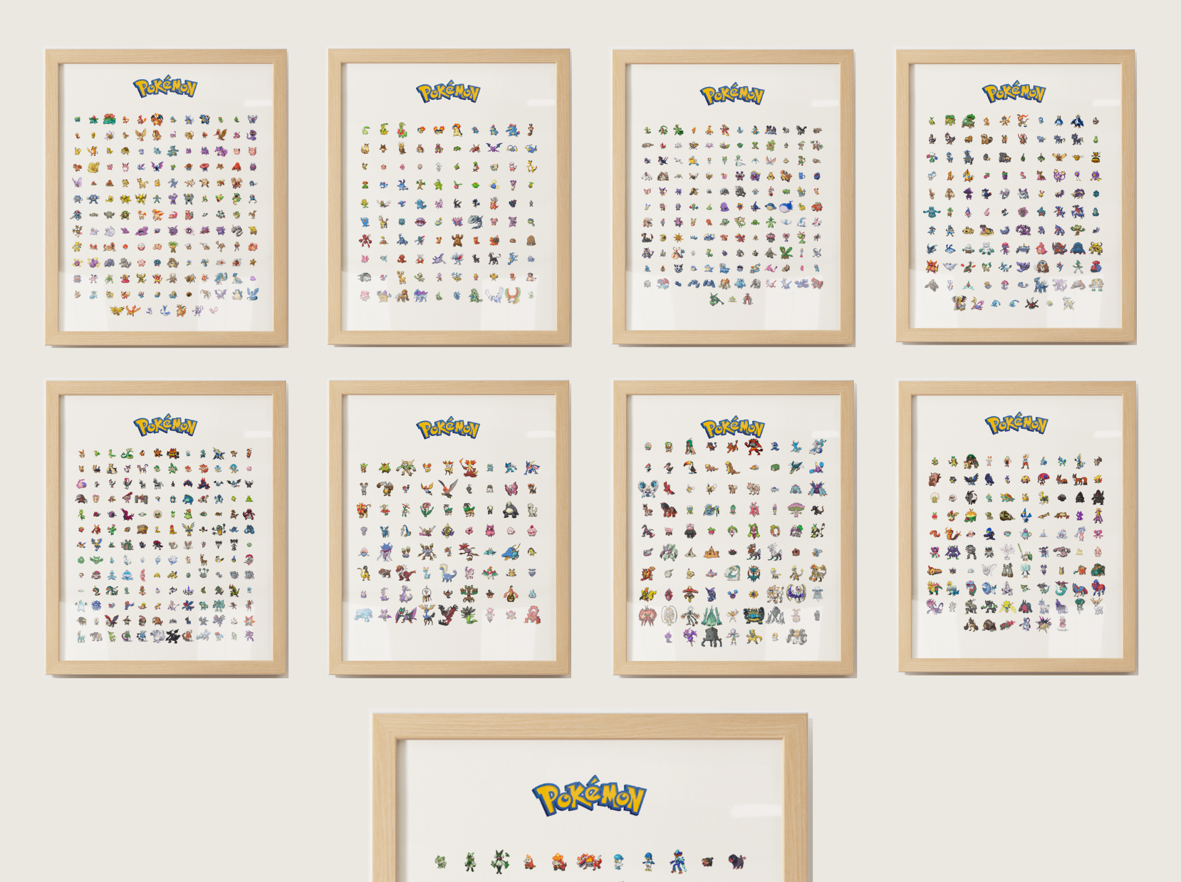 Whether you are decorating a kids bedroom, a game room, or your own collector space, this bundle delivers a full timeline of Pokémon history in a format that feels instantly recognizable and display ready.