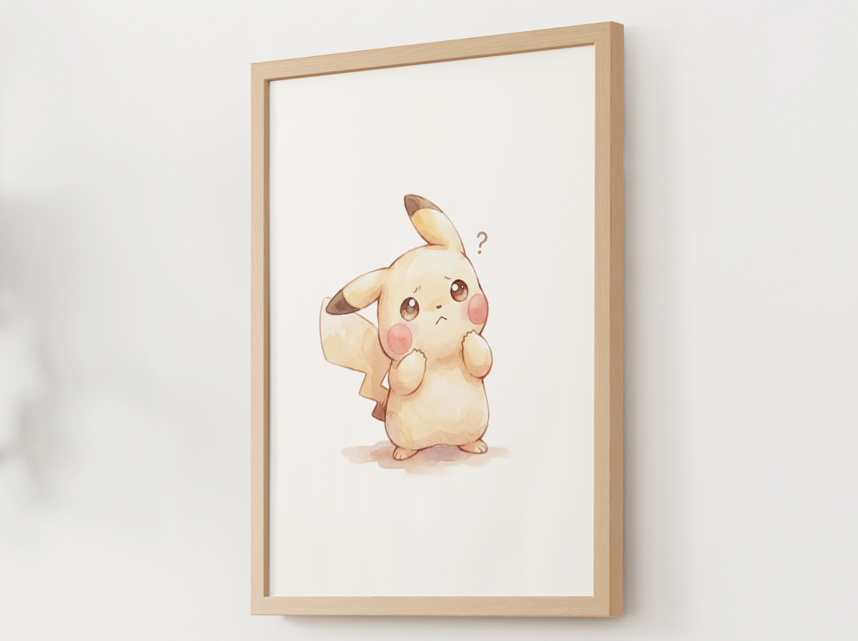 This print captures Pikachu’s curious, slightly puzzled expression in a soft nursery friendly watercolor style. It is a sweet choice for kids spaces and a perfect match if you are building the full emotions set.