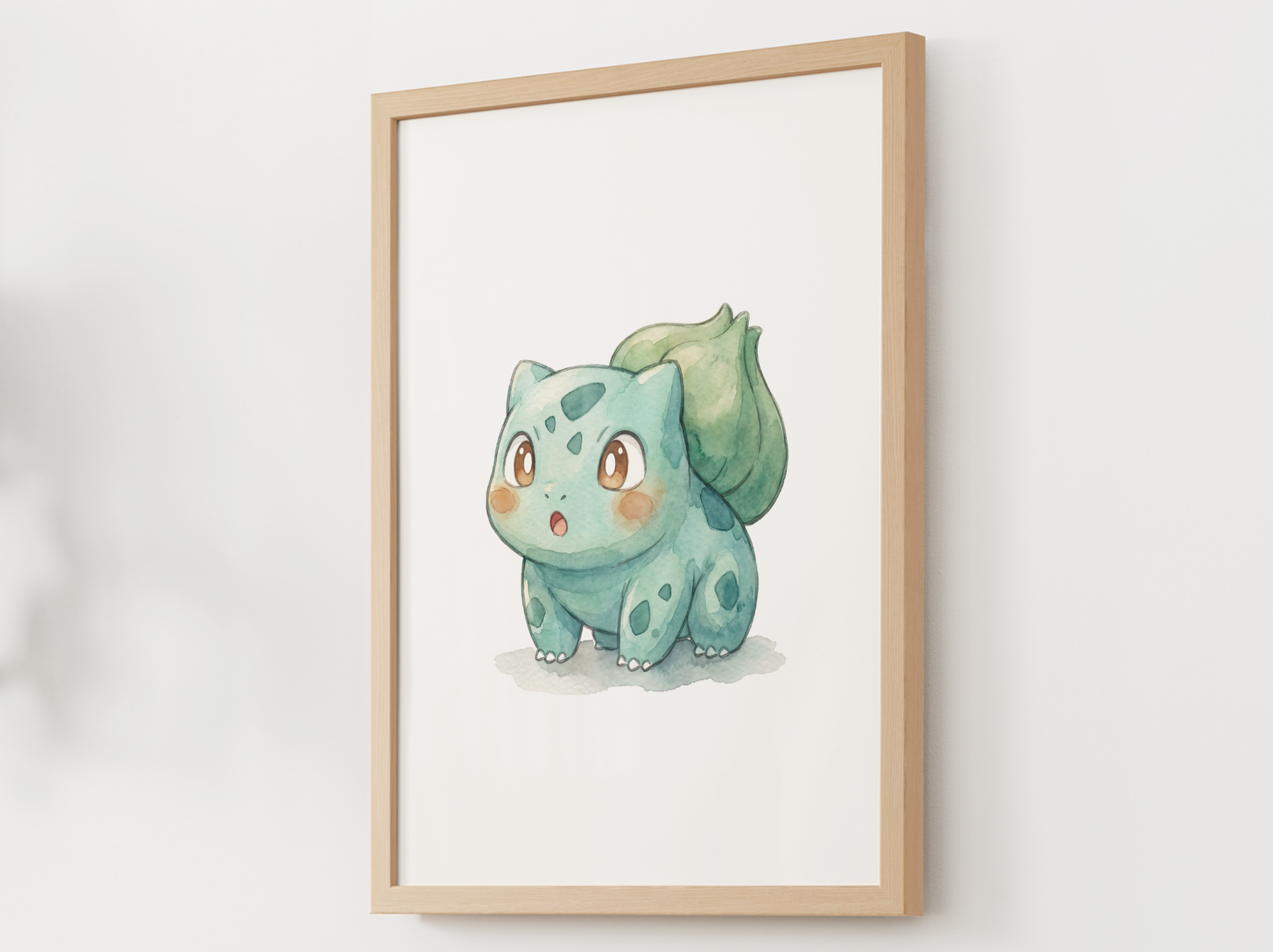 This print captures Bulbasaur’s wide eyed, open mouth surprise in a soft nursery friendly watercolor style. It is a perfect match for baby rooms, kids bedrooms, and playrooms, especially if you are building a full emotions collection.