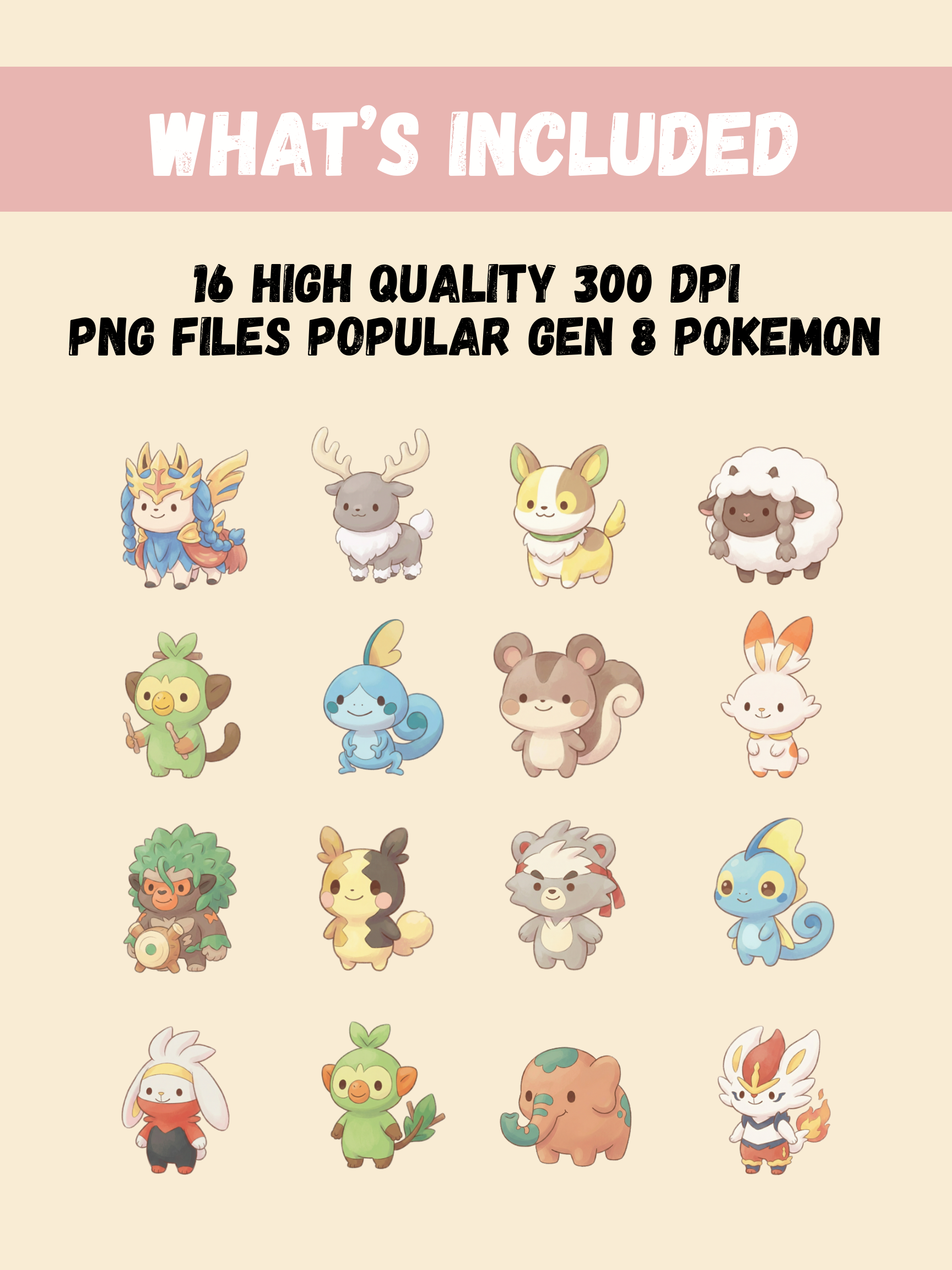 You will receive 16 high quality PNG files, each featuring a different popular Generation 8 Pokémon in a matching chibi style.