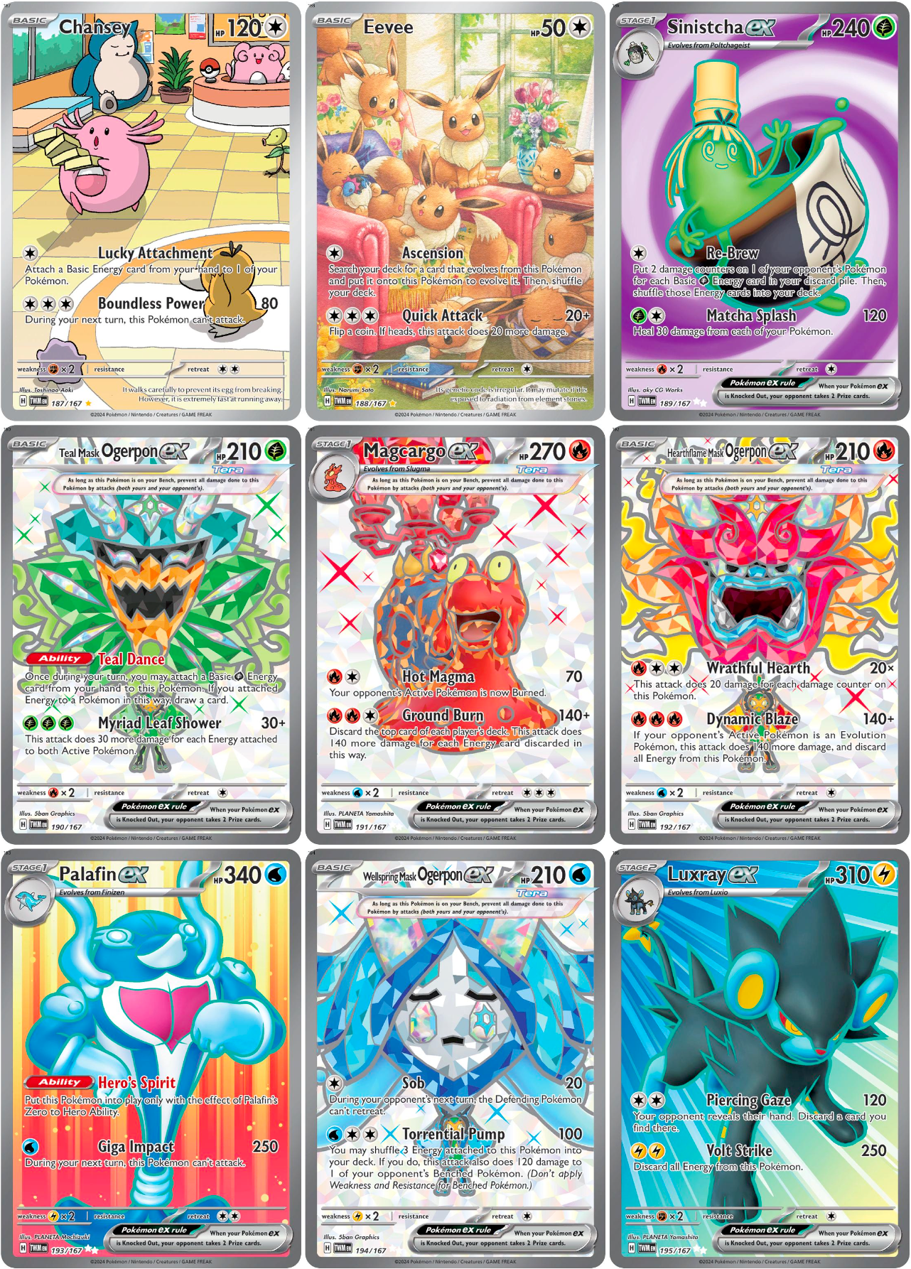 Twilight Masquerade immerses collectors in a festival of masks, introducing the legendary Ogerpon in multiple forms alongside vivid Illustration Rares and powerful Pokémon ex. With its colorful, mysterious artwork and fan-favorite chase cards, this set is a standout chapter of the Scarlet & Violet era that belongs in every binder.