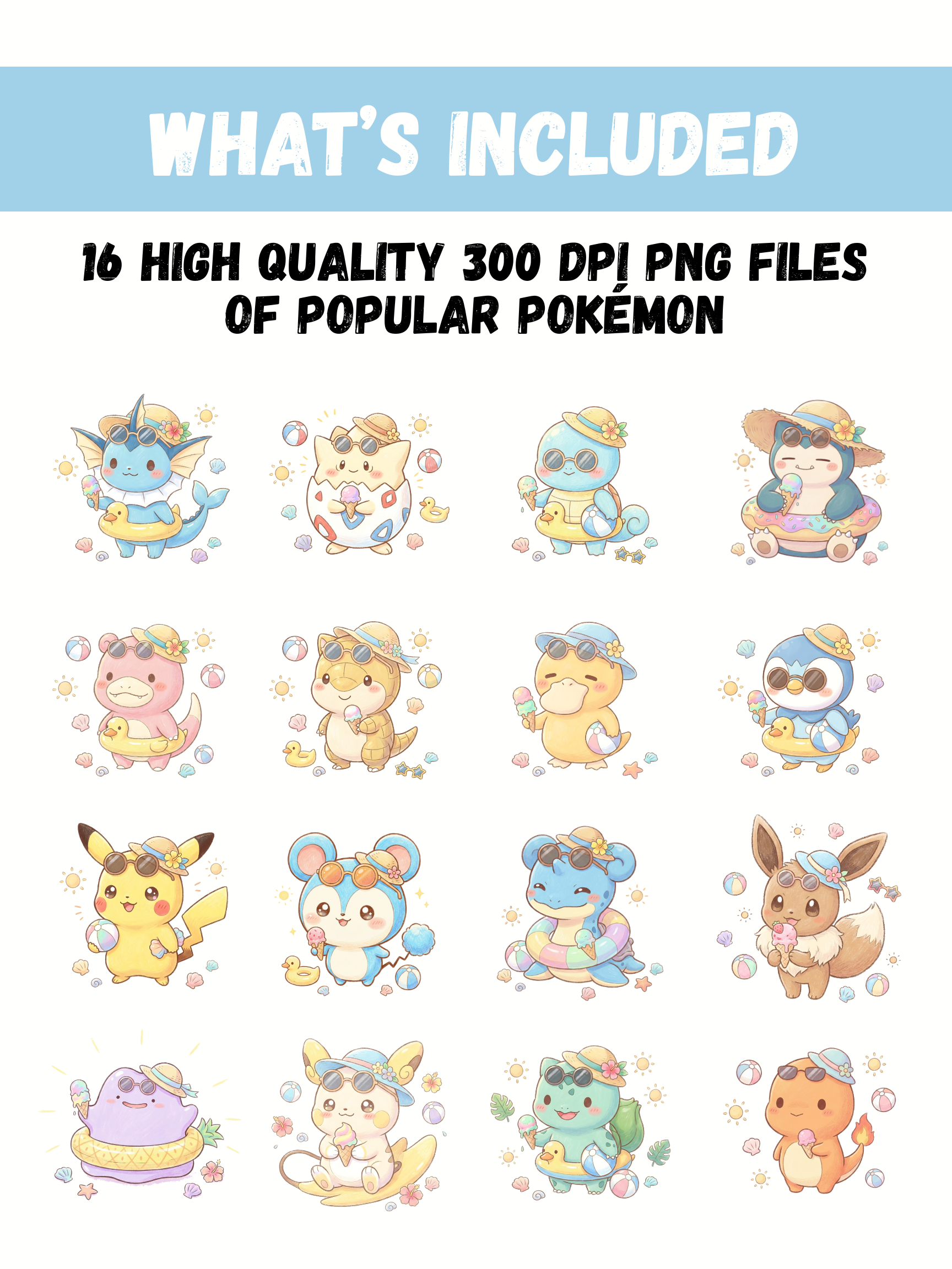 Summer Chibi Pokemon PNG Bundle, 16 Cute Pencil Crayon Style Designs, Kawaii Clipart, Transparent PNG, Instant Download