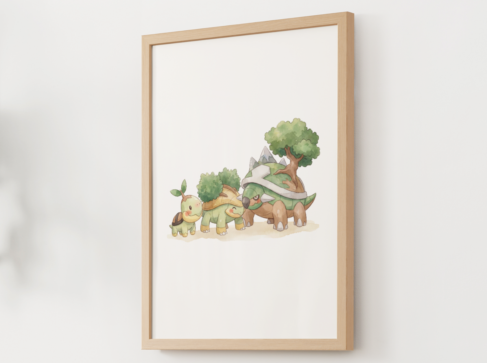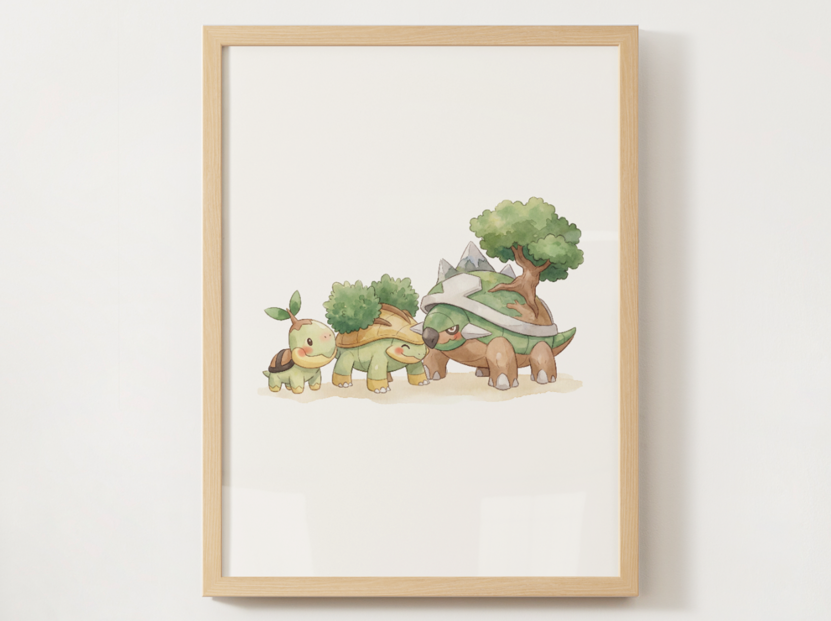 Bring cozy Sinnoh nostalgia to your nursery or kids room with this Turtwig evolution line poster designed to feel soft, clean, and frame ready. This print highlights the full evolution journey from Turtwig to Grotle to Torterra, styled in gentle colors with a calm, centered layout that keeps the space warm and peaceful for baby rooms, kids bedrooms, and playrooms.